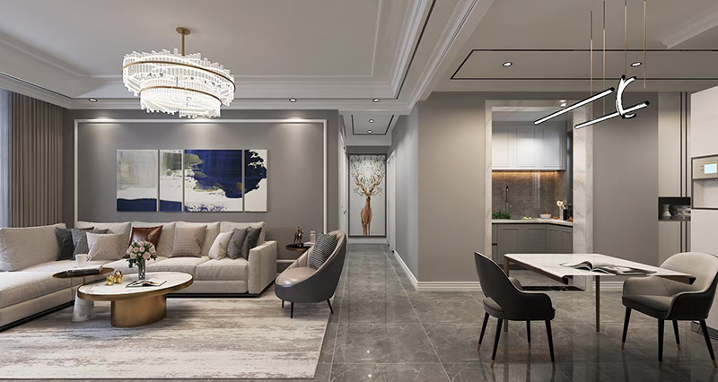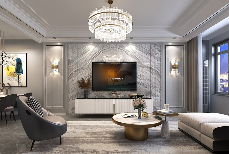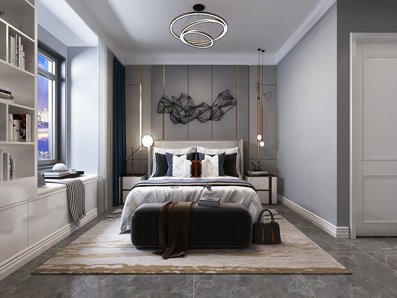 設想理念:此計劃設想是古代輕奢結果,石材與金屬的結實感,與硬包護墻板的溫馨感,搭配口角灰色系,公道化的規劃增添收納空間,完善的表現出輕奢的美感。